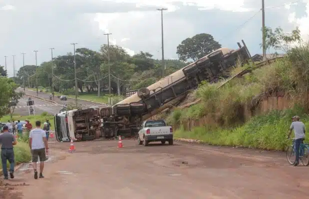 Uma carreta tanque do transporte de gás GLP tombou e desceu o aterro e agora pouco no viaduto da Avenida Duque de Caxias em frente ao frigorífico JBS na Vila Popular em Campo Grande. Por razões desconhecidas a carreta aparentemente ficou sem controle, saiu da pista tombando no aterro até parar na pista lateral.