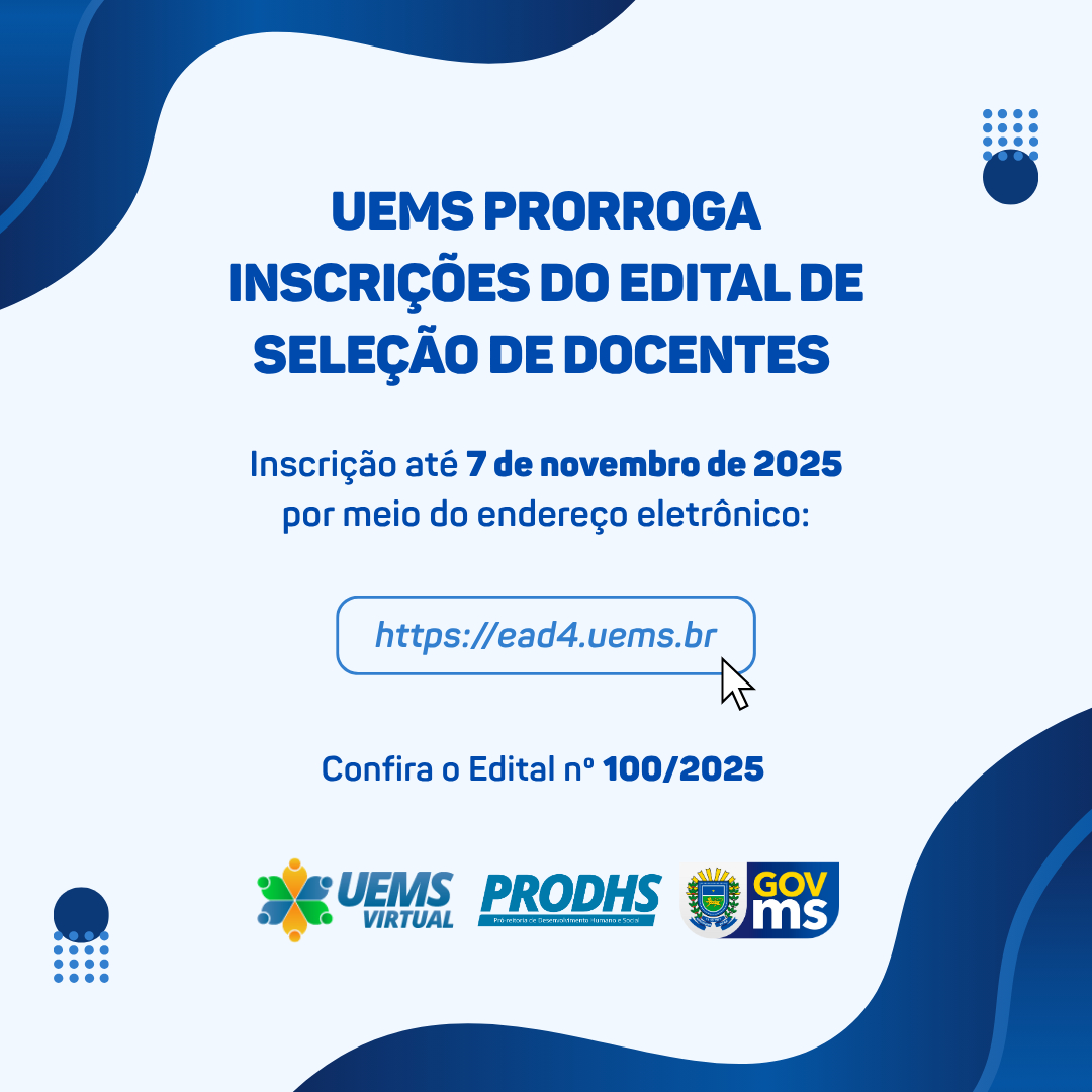 A Universidade Estadual de Mato Grosso do Sul (UEMS), por meio da Pró-Reitoria de Desenvolvimento Humano e Social (PRODHS) e da Pró-Reitoria de Ensino (PROE), informa que o prazo de inscrições do Edital de Seleção de Docentes nº 100/2025 foi prorrogado. Os interessados têm até o dia 7 de novembro de 2025, às 13h (horário de Mato Grosso do Sul), para efetuar a inscrição de forma exclusivamente online, por meio do endereço eletrônico http://ead4.uems.br .
