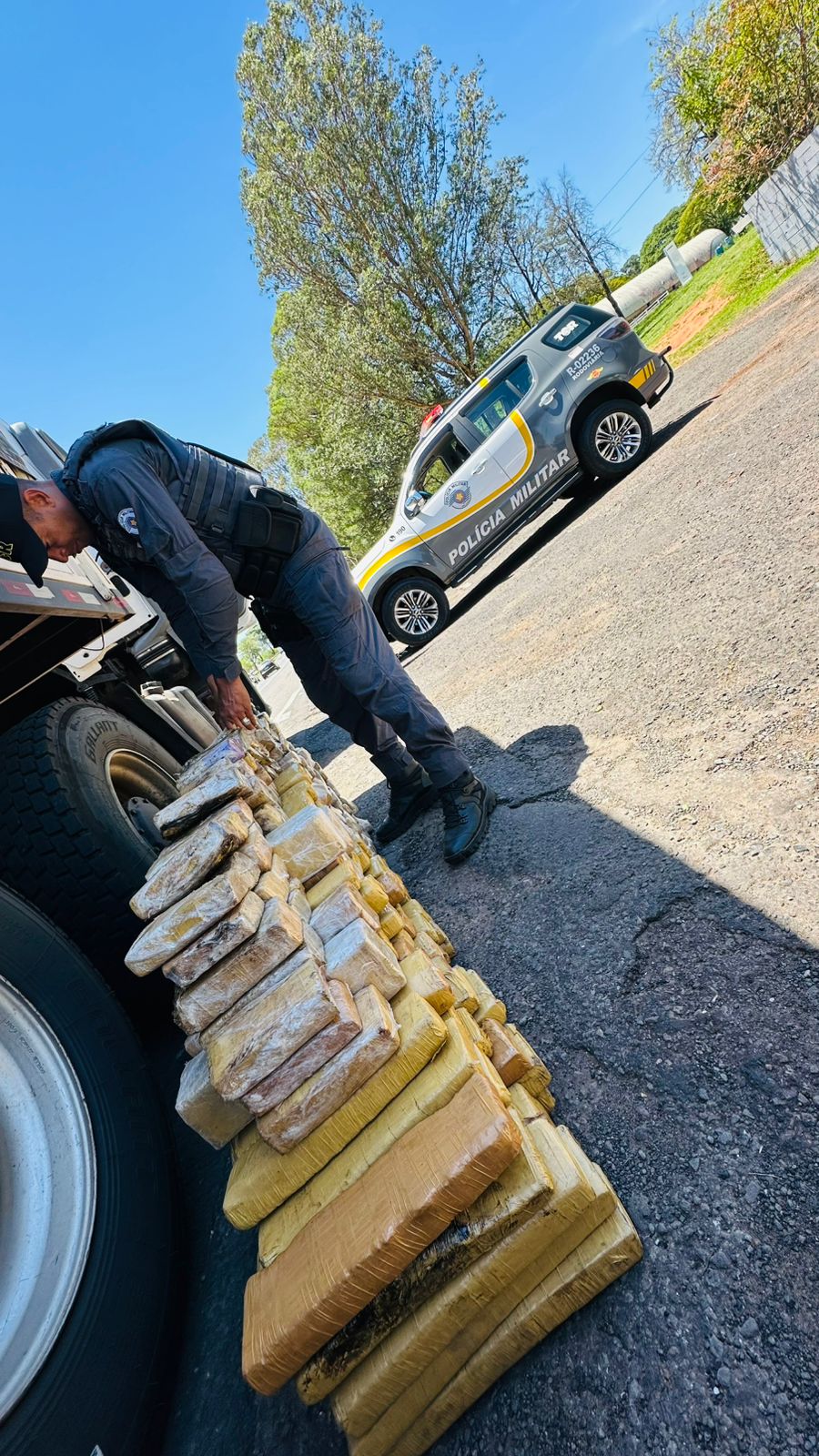 A revista veicular minuciosa levou à descoberta da maconha, que estava escondida em compartimentos da cabine da carreta, bem como no interior dos pneus steps (sobressalentes).