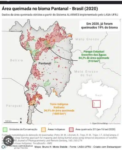 Esse discurso de que o culpado pelos incêndios florestais no Pantanal é o produtor rural precisa acabar. Vejam as duas fotos em anexo – uma, o mapa do fogo em 2020, a outra, o mapa do fogo nos últimos 7 dias de junho de 2024. Será que os produtores das sub-regiões da Nhecolândia e do Paiaguás e outras áreas que o mapa mostra sem focos de incêndio, são mais bem intencionados ou cuidadosos do que os proprietários que margeiam a beira dos rios e as reservas e parques?